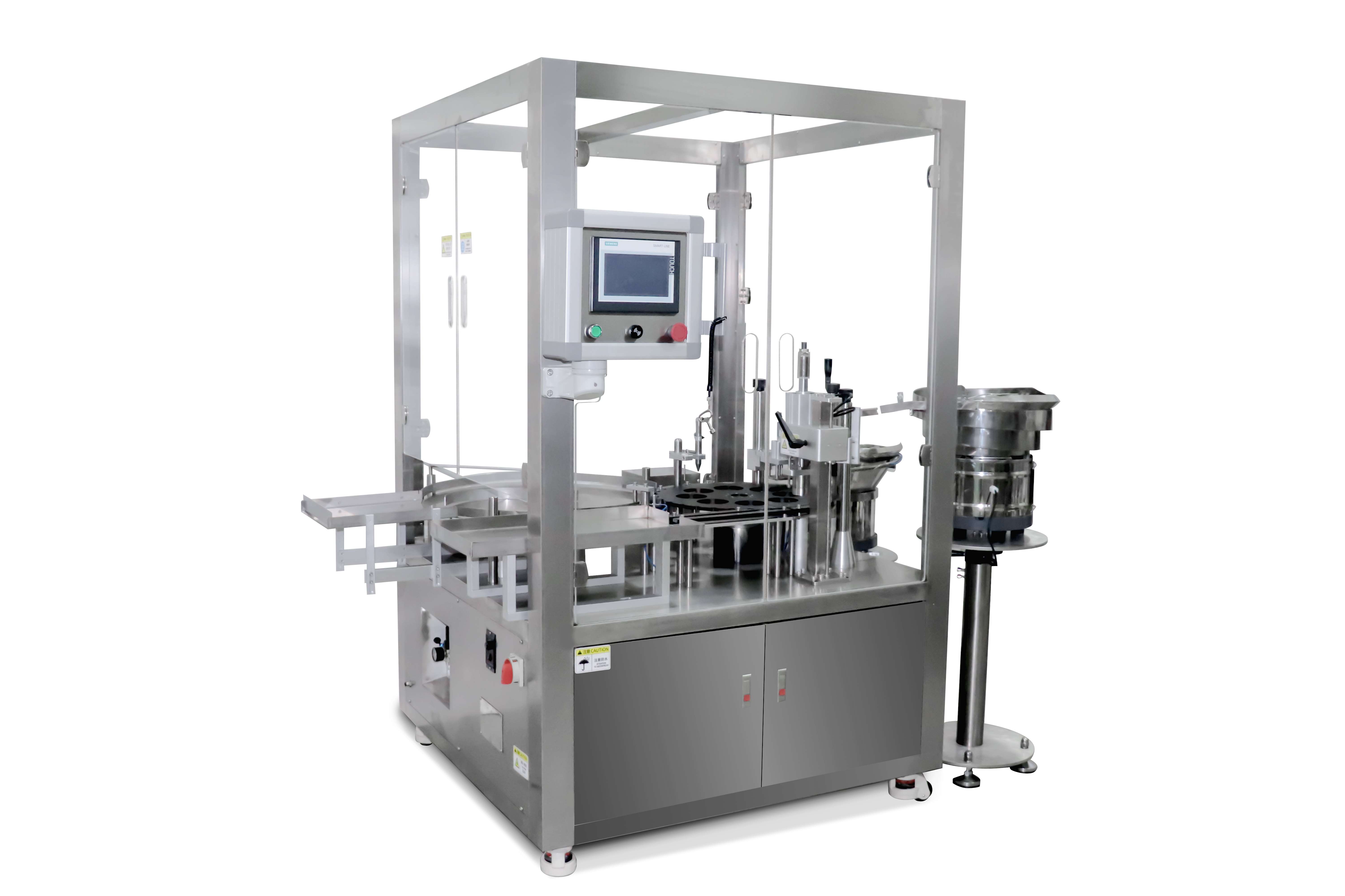 自動灌裝軋蓋機一體機可用于西林瓶、精油瓶、香水瓶全自動灌裝旋蓋及鎖蓋設(shè)備。整套流程分為:理瓶-灌裝-壓塞-掛蓋-軋蓋,其特點為生產(chǎn)穩(wěn)定,對包材通用性強。